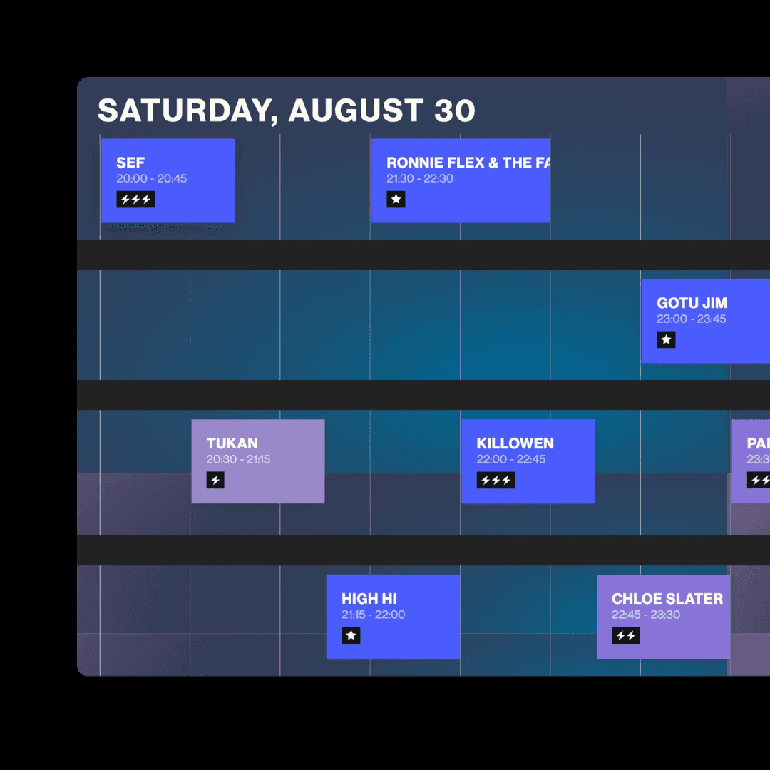 Push last-minute changes live the moment you need them. Your fully on-brand timetable lives seamlessly on your site, keeps visitors on your own channels, and reveals exactly which artists your audience cares about.